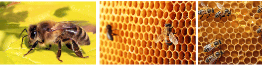 Alvéoles en hexagone, et angle de construction, pour maximiser leurs réserves. Et autres formes aussi, selon les besoins… L’hexagone est la structure la plus efficace pour le plus grand montant de miel pour le moindre montant de structure en cire. Ils inclinent aussi leurs alvéoles d’un léger degrée pour que le miel ne coule pas.