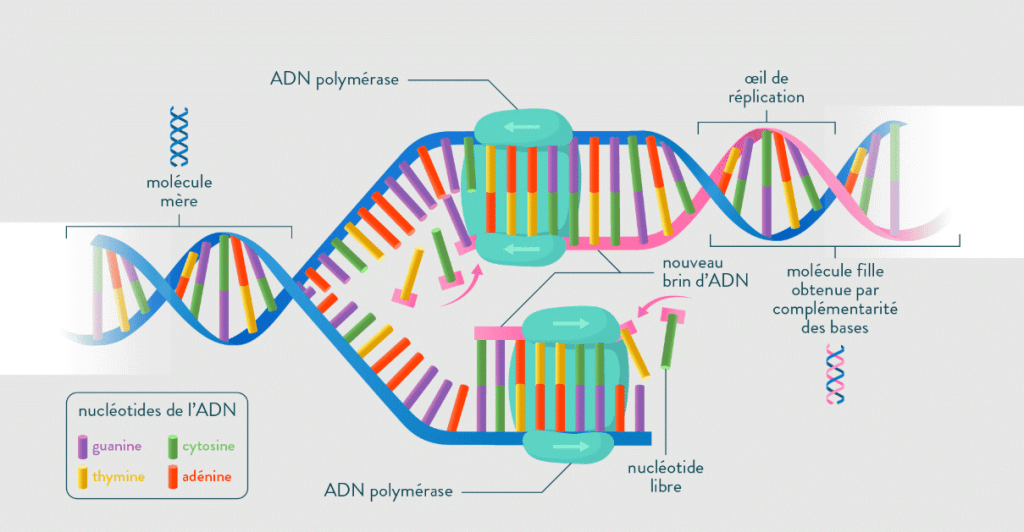 Quand une cellule se multiplie, il faut que l’ADN se soit aussi multiplié pour être passé à toutes les nouvelles cellules.
