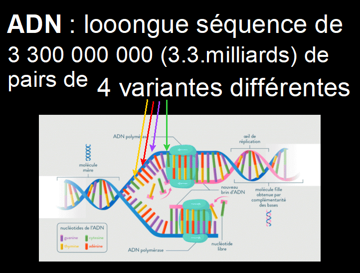 L’ADN est une longue séquence de 4 variables, longue, très longue environ 3.3 milliards de pairs.